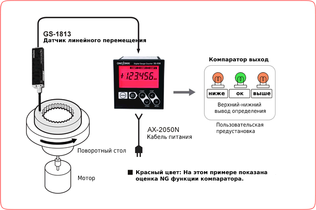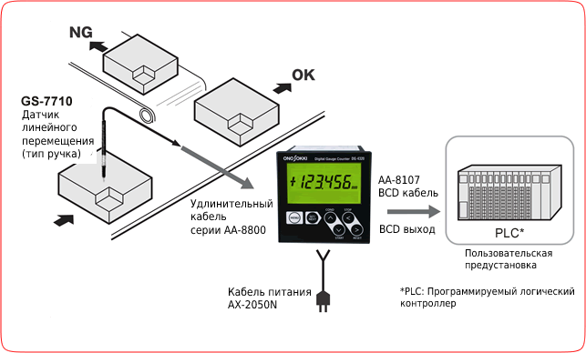 Оценка обработанных деталей OK / NG может производиться автоматически с помощью функции вывода BCD и PLC *. Функция компаратора решает, находятся ли эти размеры в пределах указанных значений или нет. Затем ПЛК * выбирает ОК детали через сигнал BCD DG-4340.